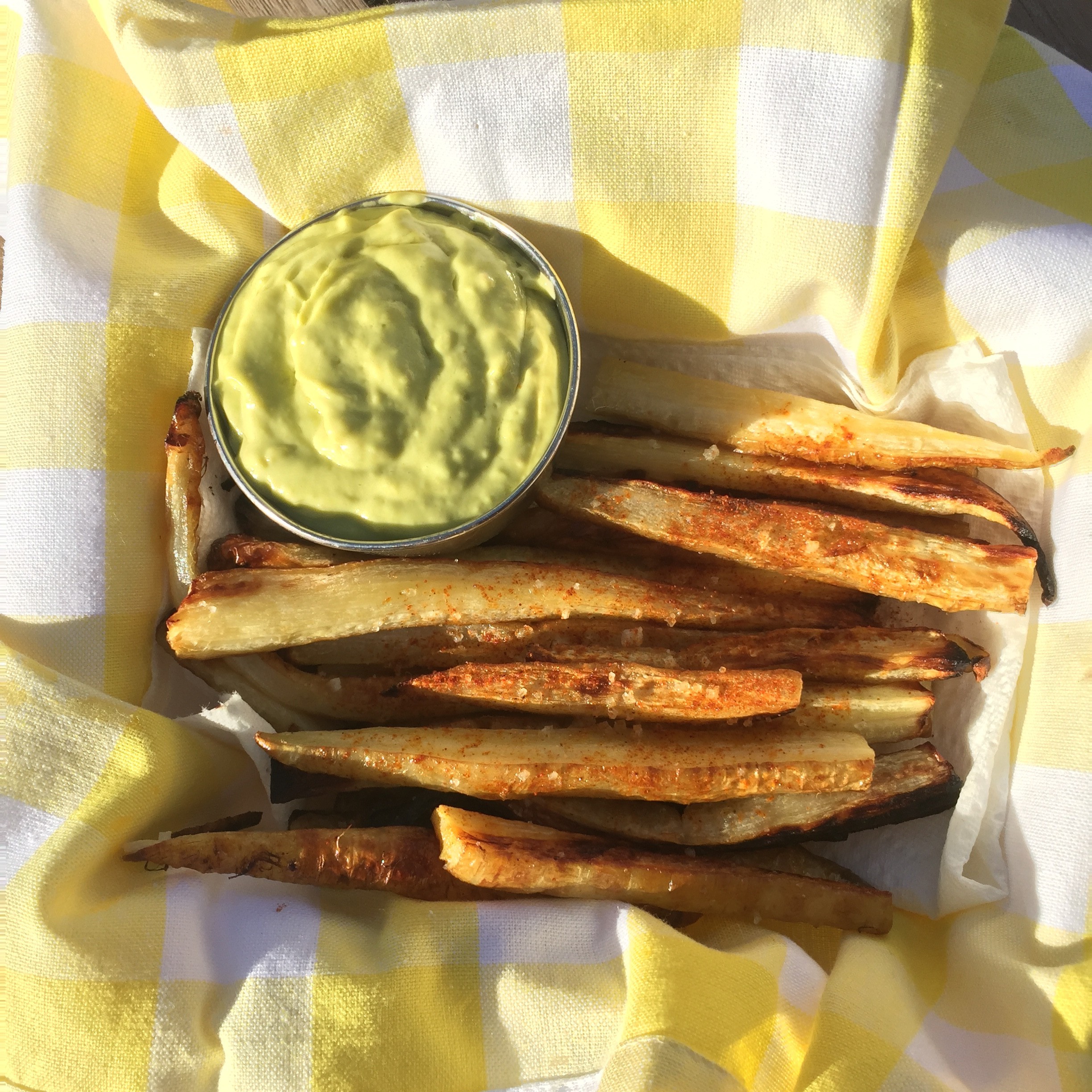 Parsnip Fries with Homemade Raw Avocado Mayonnaise is the most delicious way to eat these sweet, earthy vegetables.